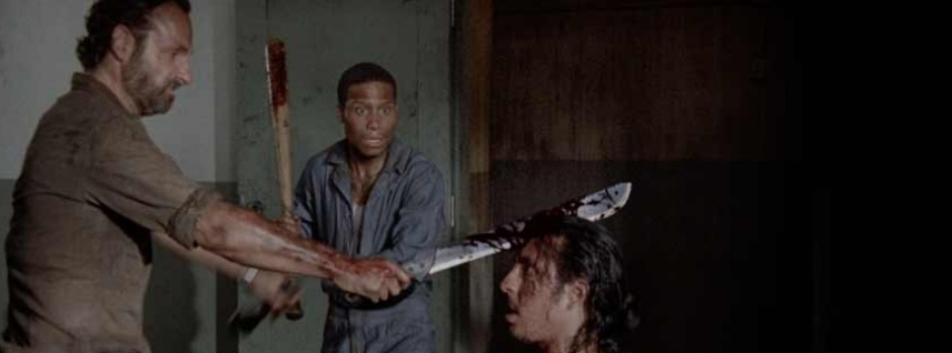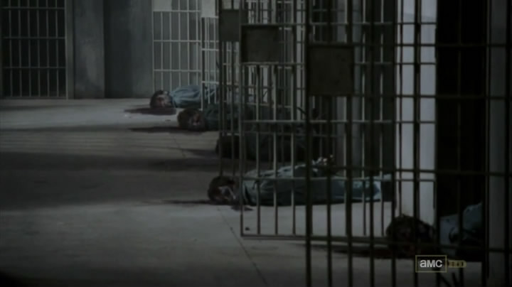 Rick, Daryl and T-Dogg lead the prisoners to another cell block. Through the darkened hallways the group of survivors and prisoners run into a group of walkers. Rick motions for the prisoners to claim their cell block. Still not used to what to do, the prisoners begin a prison beat down and shanking. No use, of course. The trio stares at disbelief and they look at each other shaking their heads in shame.