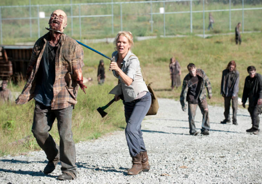 Andrea finally grows a pair and decides to head to the prison. What follows is defintiely one of the most interesting things I have witnessed on this show. Previously, we learned that a zombie without the means to eat (i.e. no arms or jaw) would effectually become neutered and not attack anyone. That tamed zombie can then be used to provide an area of protection against other zombies from being attracted. We had never seen the process done in such a primitive fashion. Milton holds down the zombie as Andrea chops of the arms with a hatchet. Then the really fun part happens as Andrea places a large rock between the walker’s teeth, letting her curb stomp the jaw loose. Fun times, fun times.
