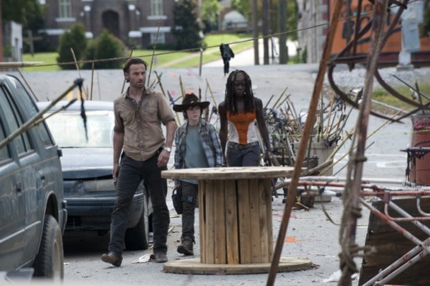 Rick knows a few locations where guns are licensed in town and decides to check those areas out. They stumble upon a main street been set up as a zombie death trap. Not a death trap for people filled with zombies, but an area set to trap and kill zombies. As they begin to make their way through the spike-filled street, the trio are attacked by a lone gunman on a rooftop. It is a tense few moments but it ends when Carl is able to sneak up on the gunman and shoot him in the ribs. We would find out that he has body armor and still alive.
