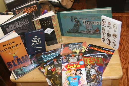 Free Comic Book Day / California Bookstore Day has come and gone and I must say we made out like bandits. The bookish awesome kind of bandits anyway. This year the CYaN staff took it to the next level and hit up independent bookstores and the local library sale to celebrate. As you can see from the picture the selection is pretty varied. (click on the links to see what was available and more info on what we got).